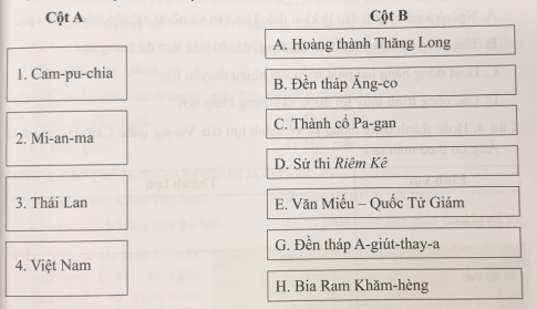Câu 7. Hãy ghép ô ở cột A với các ô ở cột B sao cho đúng về tên nước ở Đông Nam Á với một số thành tựu văn hoá tiêu biểu.