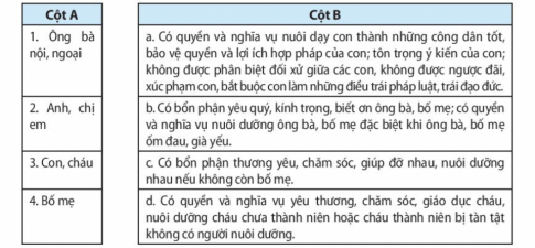 Bài tập 2. Em hãy nối mỗi chủ thể ở cột A với nội dung tương ứng ở cột B để thể hiện quy định của pháp luật về quyền và nghĩa vụ của các thành viên trong gia đình.