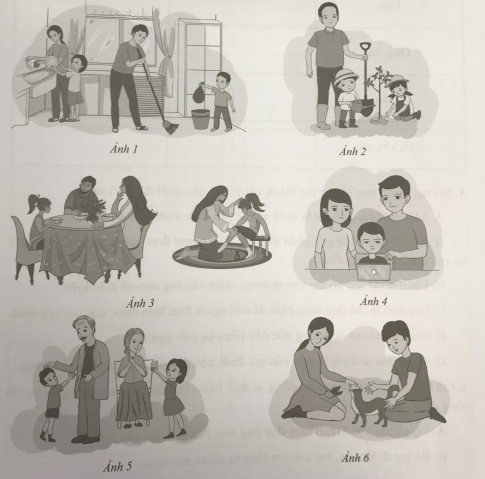 – Những mối quan hệ nào được thể hiện trong từng hình ảnh? Trong từng hình ảnh, các thành viên trong gia đình đang thực hiện những quyền, nghĩa vụ nào của mình?