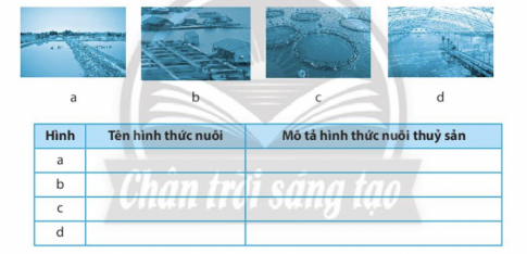 1. Quan sát hình ảnh và hoàn thành bảng bên dưới về tên và mô tả của các hình thức nuôi thuỷ sản phổ biến ở nước ta hiện nay.