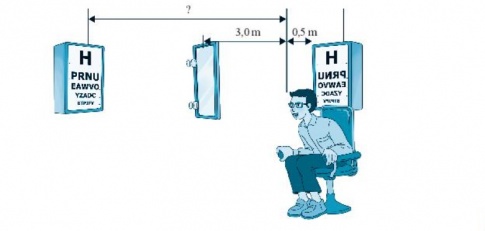 17.10. Trước khi chọn mua một cặp kính phù hợp tại một cửa hàng kính mắt, khách hàng thường phải trải qua một cuộc kiểm tra thị lực. Trong quá trình kiểm tra, người này cần đọc các chữ cái và con số trên một bảng đo thị lực từ một khoảng cách tiêu chuẩn. Khi việc kiểm tra thị lực được thực hiện trong một căn phòng nhỏ, người ta thường sử dụng gương phẳng để làm cho các chữ cái và số trên bảng đo thị lực xuất hiện xa mắt hơn. Quan sát hình dưới đây để tính khoảng cách từ mắt người khách hàng đến ảnh của các chữ cái và con số mà người này nhìn thấy qua gương phẳng.