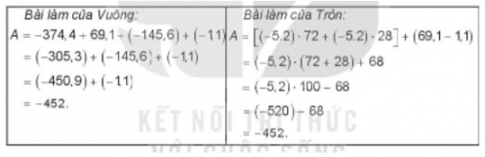 1.12. Với bài tập: Tính tổng A = -5,2.72 + 69,1 + 5,2 .(-28) + (-1,1). Hai bạn Vuông và Tròn đã làm như sau:
