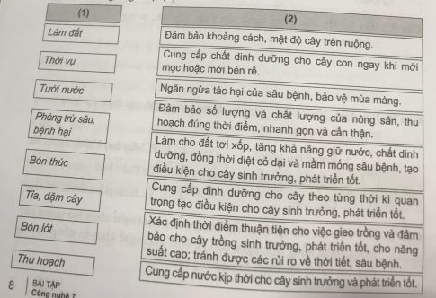 Câu 2. Hãy nối tên biện pháp kĩ thuật trong trồng trọt ở cột (1) với mục đích tương ứng ở cột (2).