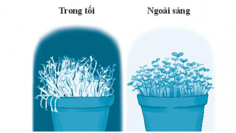 35.7. Quan sát hình dưới đây và cho biết sự khác nhau về hình thái giữa cây sinh trưởng trong tối và cây sinh trưởng ngoài sáng.