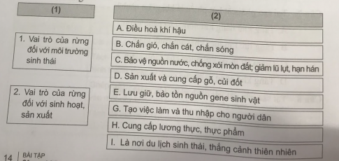 Câu 3. Hãy nối nội dung ở cột (1) với nội dung cột (2) sao cho phù hợp với vai trò của rừng.
