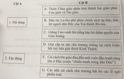 Câu 4. Hãy ghép ý ở cột A với ý ở cột B sao cho đúng với nội dung và tác động của phong trào Cải cách tôn giáo.