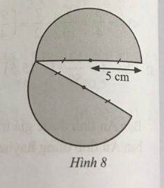 Bài 38: Người ta cắt một tấm tôn có dạng hình tròn bán kính 5 cm thành hai phần bằng nhau như hình 8. Tính chu vi của tấm tôn sau khi bị cắt (lấy $\pi$ = 3.14).
