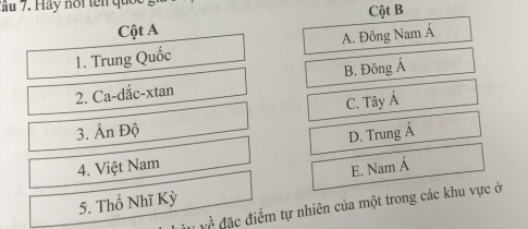 Câu 7. Hãy nối tên quốc gia ở cột A với tên khu vực tương ứng ở cột B sao cho đúng.