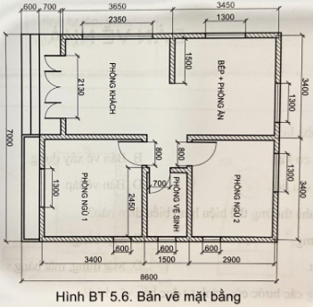 5.6 Đọc bản vẽ mặt bằng ở Hình Bài tập 5.6 và điền kết quả vào bảng sau: