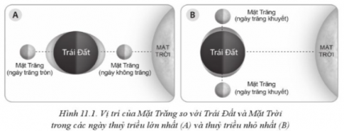 b) Nhận xét vị trí của Trái Đất, Mặt Trăng và Mặt Trời trong ngày thuỷ triều nhỏ nhất. Khi thuỷ triều nhỏ nhất, ở Trái Đất sẽ nhìn thấy Mặt Trăng như thế nào?