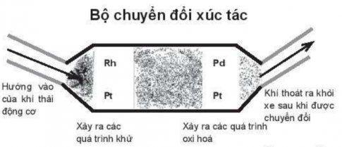16.13. Bộ chuyển đổi xúc tác là thiết bị được sử dụng để giảm lượng khi thải từ động cơ đốt trong của ô tô và các loại phương tiện giao thông hiện đại. Thiết bị có sử dụng các kim loại platinum, rhodium và palladium để thúc đẩy quá trình nhường, nhận electron của chất trong khí thải, nó hoạt động theo cơ chế phản ứng oxi hoá – khử, chuyển đổi khoảng 98 % khí thải độc hại thành khí ít độc hại hoặc không độc hại cho môi trường. Khí thải chứa các hydrocarbon bị oxi hoá thành carbon dioxide và nước, carbon monoxide thành carbon dioxide, các oxide của nitrogen bị khử thành nitrogen và oxygen giải phóng ra môi trường.