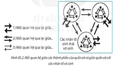 Câu 43.3. Trong quần xã sinh vật, luôn có các mối quan hệ qua lại giữa các cá thể trong quần thể, giữa các quần thể với nhau và giữa các quần thể với các nhân tố sinh thái vô sinh (Hình 43.2). Hãy cho biết các mũi tên trong hình bên thể hiện mối quan hệ nào. Lấy ví dụ minh hoạ.