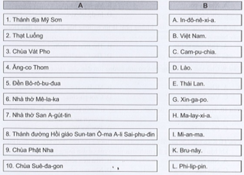 Câu 14: Hãy ghép các công trình kiến trúc ở cột A với các quốc gia Đông Nam Á ở cột B sao cho phù hợp.