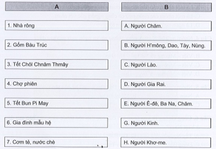 Câu 8: Hãy ghép các nội dung ở cột A với các dân tộc ở cột B sao cho phù hợp với những nét chính về đời sống vật chất và tinh thần của cộng đồng các dân tộc Việt Nam.