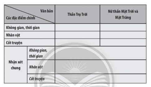 Câu hỏi 5. Điền vào bảng dưới đây các đặc điểm về không gian, thời gian, nhân vật, cốt truyện của hai văn bản Thần Trụ Trời và Nữ thần Mặt Trời và Mặt Trăng, từ đó rút ra nhận xét chung về các đặc điểm này của thể loại thần thoại.