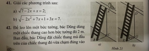 Bài 42 : Để leo lên một bức tường, bác Dũng dùng một chiếc thang cao hơn bức tường đó 2m. Ban đầu bác Dũng đặt chiếc thang mà đầu trên của chiếc thang đó vừa chạm đúng vào mép trên của bức tường (Hình 21a). Sau đó, bác Dũng dịch chuyển chân thang vào gần bức tường thêm 1m thì bác Dũng nhận thấy thang tạo với mặt đất một góc 45° (Hình 21b). Bức tường cao bao nhiêu mét?