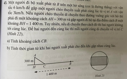 Bài 43 : Một người đi bộ xuất phát từ B trên một bờ sông (coi là đường thẳng) với vận tốc 6km/h để gặp một người chèo thuyền xuất phát cùng lúc từ vị trí A với vận tốc 3km/h. Nếu người chèo thuyền di chuyển theo đường vuông góc với bờ thì phải đi một khoảng cách AH = 300m và gặp người đi bộ tại địa điểm cách B một khoảng BH = 1 400m. Tuy nhiên, nếu di chuyển theo cách đó thì hai người không tới cùng lúc. Để hai người đến cùng lúc thì mỗi người cùng di chuyển về vị trí C (Hình 22).