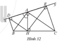 Bài 40. Cho HÌnh 32 có $\widehat{BAC}=90^{\circ}$, AH vuông góc với BC tại H, $\widehat{xAB}=\widehat{BAH}$, Ay là tia đối của tia Ax. BD và CE vuông góc với xy lần lượt tại D và E. Chứng minh: