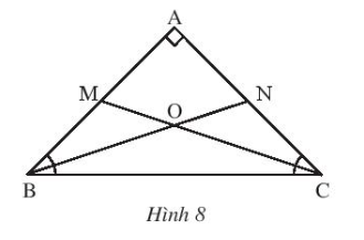 Bài 6. Cho tam giác ABC vuông cân tại A. Tia phân giác của góc B cắt AC tại N, tia phân giác của góc C cắt AB tại M. Gọi O là giao điểm của BN và CM.