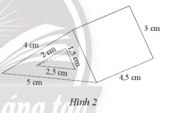 Bài 7. Một khối kim loại có dạng hình lăng trụ đứng đáy tam giác vuông có kích thước hai cạnh gốc vuông là 3 cm, 4 cm, cạnh huyền 5 cm. Người ta khoét một lỗ hình lăng trụ đứng đáy tam giác vuông hai cạnh góc vuông có kích thước là 2 cm, 1.5 cm cạnh huyền 2.5 cm (Hình 2). Tính thể tích khối kim loại đó (không tính cái lỗ).