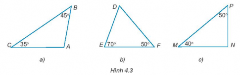 4.1. Hãy tính các số đo các góc A, D, N trong tam giác dưới đây (H.4.3). Trong các tam giác đó, hãy chỉ ra tam giác nào là nhọn, tù, vuông.