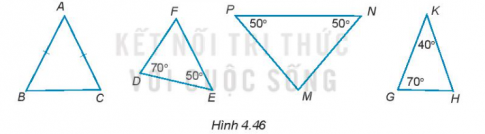 4.41. Trong những tam giác dưới đây (H.4.46), tam giác nào là tam giác cân, cân tại đỉnh nào? Vì sao?