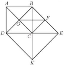 Cho hình vuông ABCD có hai đường chéo AC và BD cắt nhau tại O. Trên tia đối của tia CB lấy điểm K sao cho BC = CK. Từ điểm B kẻ đường thẳng song song với AC cắt tỉa DC tại E. Gọi F là trung điểm của BE.