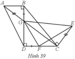 Hình thang ABCD ở Hình 39 có AB // CD, AB < CD, $\widehat{ABD}$ = 90°. Hai đường chéo AC và BD cắt nhau tại G. Điểm E nằm trên đường vuông góc với AC tại C thỏa mãn CE = AG và đoạn thẳng GE không cắt đường thẳng CD. Điểm F nằm trên đoạn thẳng DC và DF = GB. Chứng minh: