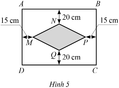 Một chiếc khăn trải bàn có dạng hình chữ nhật ABCD được thêu một hoạ tiết có dạng hình thoi MNPQ ở giữa với MP = x (cm), NQ = y (cm) (x > y > 0) như Hình 5.