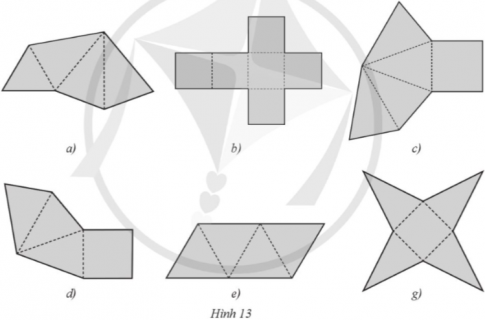 Trong những miếng bìa ở các hình 13a, 13b, 13c, 13d, 13e, 13g, miếng bìa nào không gấp lại (theo các nét đứt) để được hình chóp tam giác đều hoặc hình chóp tứ giác đều?