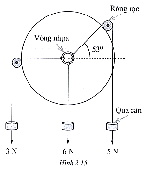 2.57 Một học sinh kiểm tra lại quy tắc tổng hợp lực đồng quy bằng cách bố trí thí nghiệm với các quả cân, ròng rọc, dây nối và một vòng nhựa mảnh, nhẹ. Lúc đầu vòng được giữ như hình 2.15.