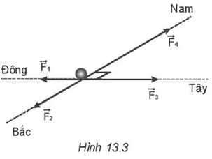 13.11 Một vật chịu tác dụng đồng thời của bồn lực như Hình 13.3. Độ lớn của các lực lần lượt là F1 = 10 N, F2 = 20 N, F3 = 22 N, F4 = 36 N. Xác định phương, chiều và độ lớn của hợp lực do các lực này tác dụng lên vật.