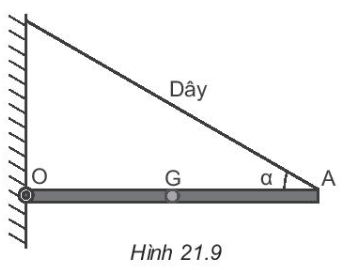 21.10 Một thanh dài AO, đồng chất, có khối lượng 1.2 kg. Một đầu O của thanh liên kết với tường bằng một bản lề, còn đầu A được treo vào tường bằng một sợi dây AB. Thanh được giữ nằm ngang và dây làm với thanh một góc $\alpha $ = 30° (Hình 21.9). Lấy g = 10 m/s$^{2}$. Tính lực căng của dây.