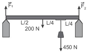 21.3 Một thanh đồng chất có chiều dài L, trọng lượng 200 N, treo một vật có trọng lượng 450 N vào thanh như hình 21.2. Các lực $\vec{F_{1}},\vec{F_{2}}$ của thanh tác dụng lên hai điểm tựa có độ lớn lần lượt là