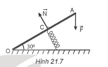 21.8 Một thanh OA có khối lượng không đáng kể, chiều dài 30 cm, có thể quay dễ dàng quanh trục nằm ngang O. Gắn vào điểm giữa C một lò xo. Người ta tác dụng vào đầu A một lực F = 20 N hướng thẳng đứng xuống dưới (Hình 21.7). Khi thanh ở trạng thái cân bằng, lò xo có phương vuông góc với OA và OA hợp với phương nằm ngang một góc 30°.