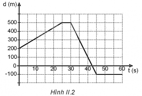 II.3 Hình II.2 là đồ thị độ dịch chuyển - thời gian của chuyển động của một xe máy đi giao hàng online chạy trên đường thẳng. Xe khởi hành từ địa điểm cách nơi nhận hàng 200 m về phía bắc.