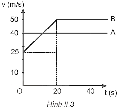 II.5 Hình II.3 là đồ thị vận tốc - thời gian của hai ô tô A và B cùng chạy theo một hướng trong 40 s. Xe A vượt qua xe B tại thời điểm t = 0. Để bắt kịp xe A, xe B tăng tốc trong 20 s để đạt vận tốc 50 m/s.