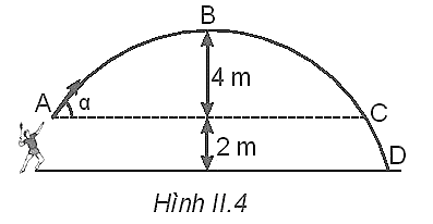 II.8 Hình II.4 vẽ quỹ đạo của một quả cầu lông được đánh lên với vận tốc ban đầu v$_{o}$ = 10 m/s ở độ cao 2 m so với mặt đất. Bỏ qua sức cản của không khí và lấy g = 9,8 m/s$^{2}$