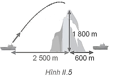II.9 Một con tàu chiến ở bên này ngọn núi trên một hòn đảo, bắn một viên đạn với vận tốc ban đầu 250 m/s theo phương nghiêng góc 75$^{o}$ so với mặt nước biển tới đích là một con tàu khác nằm ở phía bên kia ngọn núi. Biết vị trí của hai con tàu và độ cao của ngọn núi được mô tả như Hình II.5. Hỏi viên đạn có qua được đỉnh núi không và có rơi trúng con tàu kia không?