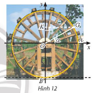 Bài tập 6 trang 33 toán lớp 11 tập 1 Chân trời: Khoảng cách từ tâm một guồng nước đến mặt nước và bán kính của guồng đều bằng 3m. Xét gàu G của guồng. Ban đầu gàu G nằm ở vị trí A (Hình 12)