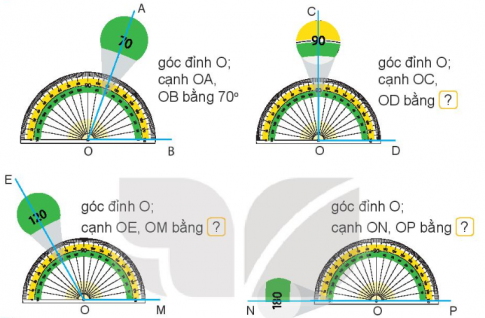 Quan sát thước đo góc rồi nêu số đo của mỗi góc (theo mẫu).