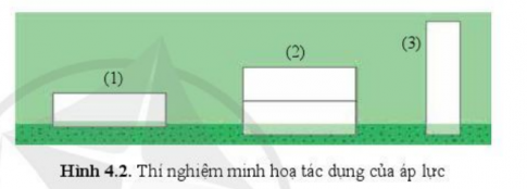 Câu hỏi 2: So sánh độ lớn áp lực, diện tích bị ép của trường hợp (2), (3) với trường hợp (1) (hình 4.2). Từ độ lún của bột trong các trường hợp, chỉ ra mối liên hệ giữa áp suất với áp lực và diện tích bị ép.
