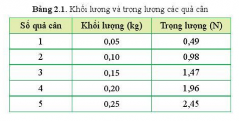 Vận dụng 2: Xác định số chỉ đo trọng lượng của các quả cân trong Bảng 2.1 khi chúng được đưa lên bề mặt Mặt Trăng. Lấy gia tốc rơi tự do trên Mặt Trăng là 1,6 m/s2