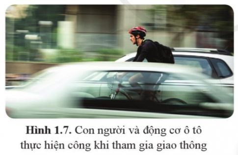 Câu hỏi 6: So sánh công của người đạp xe và động cơ ô tô trong trường hợp ở hình 1.7. Người hay động cơ thực hiện công nhanh hơn ?