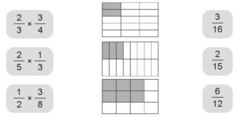 b) Nối thẻ ghi phép nhân phân số với thẻ hình và thẻ ghi kết quả thích hợp: