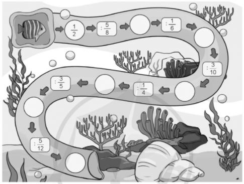 Hãy chỉ đường giúp chú cá về nhà bằng cách thực hiện các phép chia phân số rồi viết kết quả vào ô trống: