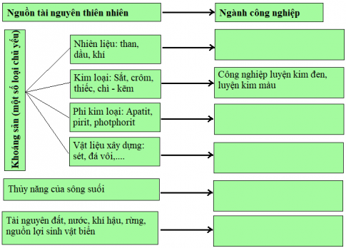 Đọc thông tin kết hợp với những hiểu biết của em, hãy lập và hoàn thành sơ đồ theo yêu cầu dưới đây về các nguồn tài nguyên thiên nhiên để phát triển các ngành công nghiệp tương ứng